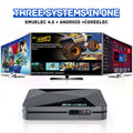 The console features a dual system setup, running both EmuELEC for retro gaming and Android 9.0 for smart TV functionality. Switch effortlessly between gaming and streaming your favorite movies, shows, and apps.
